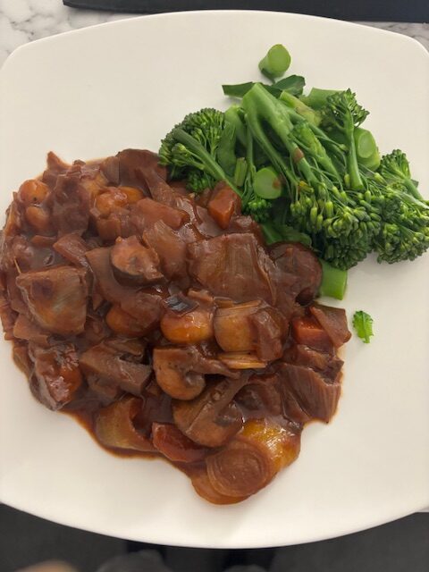 - Add the tomato purée, red wine and balsamic vinegar, Worcester sauce and the stock and cook for 20 minutes until vegetables are soft and the liquid has reduced slightly.
